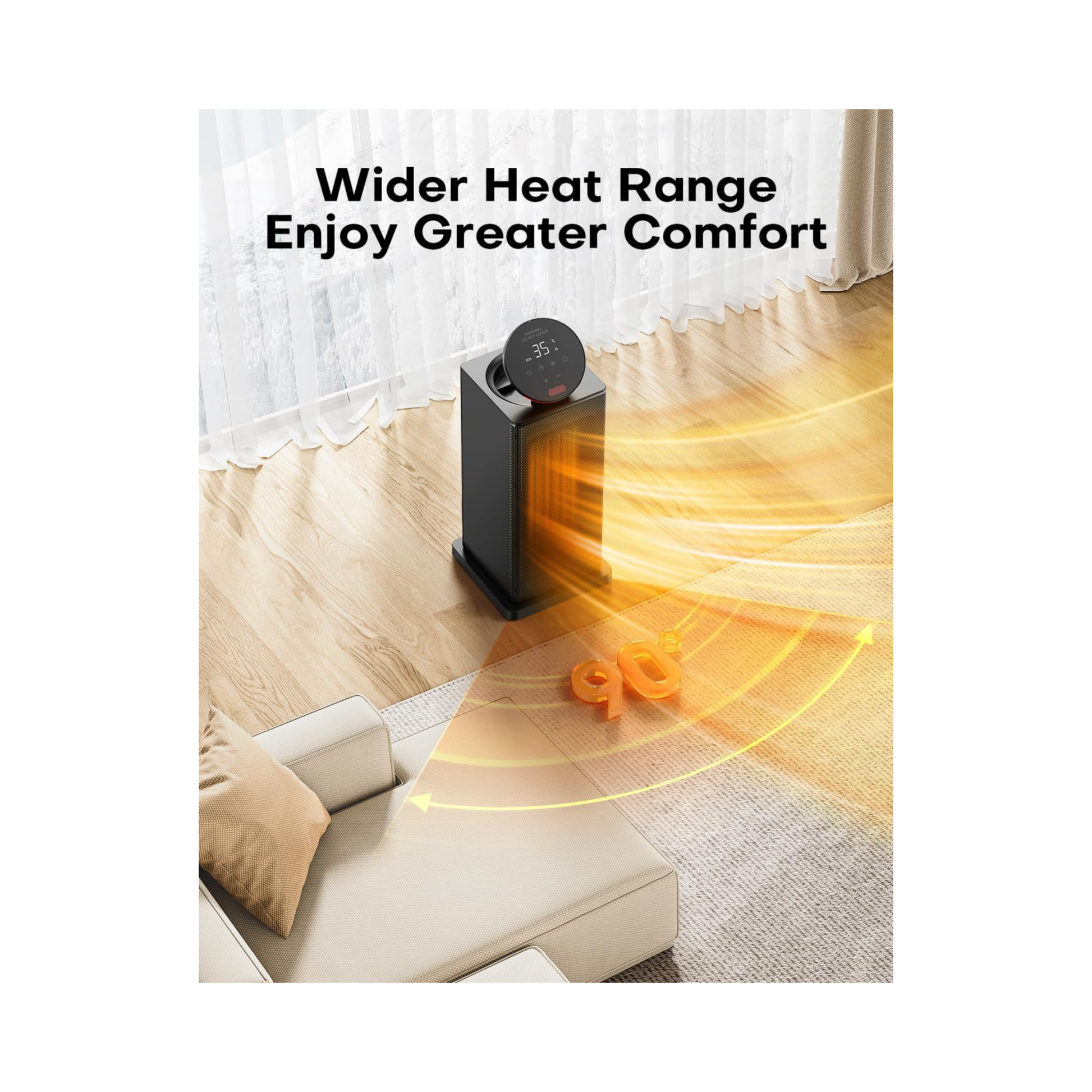 这款 PTC 陶瓷暖风机配备大面积发热元件与宽幅出风口,迅速提升室温,出风均匀、加热更高效。支持 90° 广角摇头(左右各 45°),让暖风覆盖整间房间。提供高热档、低热档、ECO 节能恒温及自然风四种模式,ECO 模式下内置温控器可在 15–35°C 范围内自动启停调节,兼顾舒适与节能。配备 1–24 小时定时器、可调高度触控面板及全功能遥控器,操作便捷灵活。内设倾倒断电保护、过热自动断电与阻燃外壳,多重安全防护使用更安心。首次使用前建议短暂通风,使用时保持与墙体至少 0.9 米安全距离。